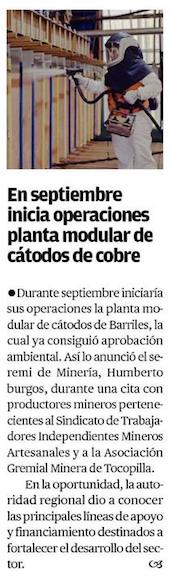 En septiembre inicia operaciones planta modular de cátodos de cobre - (El Mercurio de Calama)