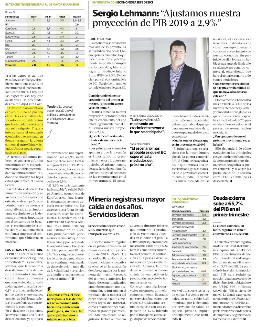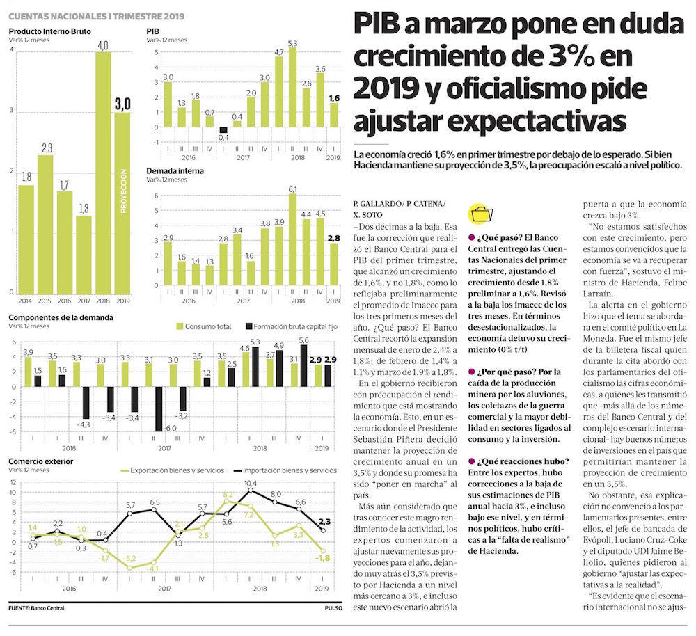 Economía crece solo 1,6% el primer trimestre, la menor variación desde mediados de 2017 - (El Mercurio de Santiago)