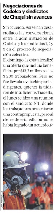 Codelco esperará hasta hoy una respuesta de los sindicatos a la oferta de pronta firma - (El Mercurio de Calama)