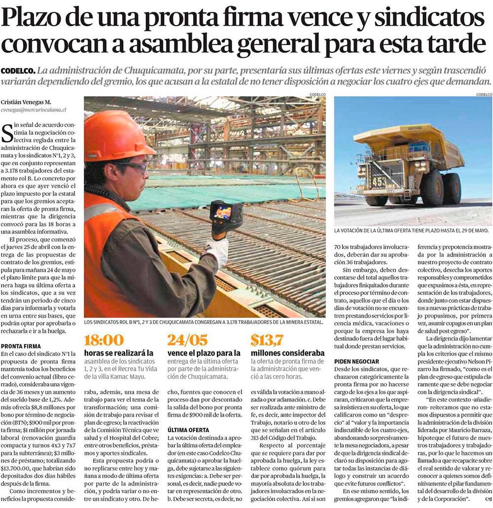 Mesa de negociación en Chuqui se quiebra y dirigencia sindical llama a votar la huelga - (El Mercurio de Santiago)