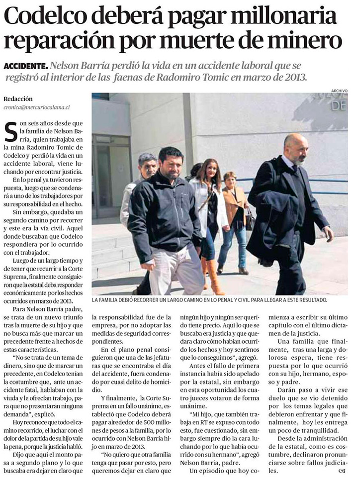 Corte Suprema ordena a Codelco pagar $483 millones a familia de trabajador muerto en accidente - (biobiochile online)
