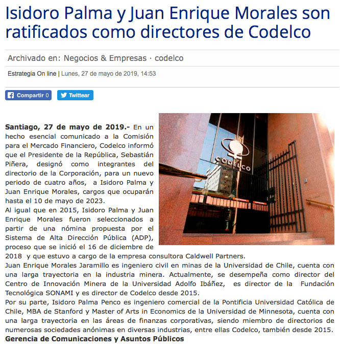 Gobierno ratifica a dos directores de Codelco seleccionados en el periodo de Bachelet - (biobiochile online)