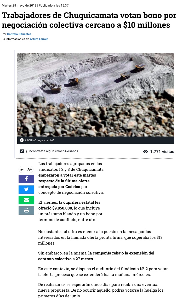 Sindicatos de Chuquicamata votan última oferta y dirigentes apuntan a huelga - (Pulso)