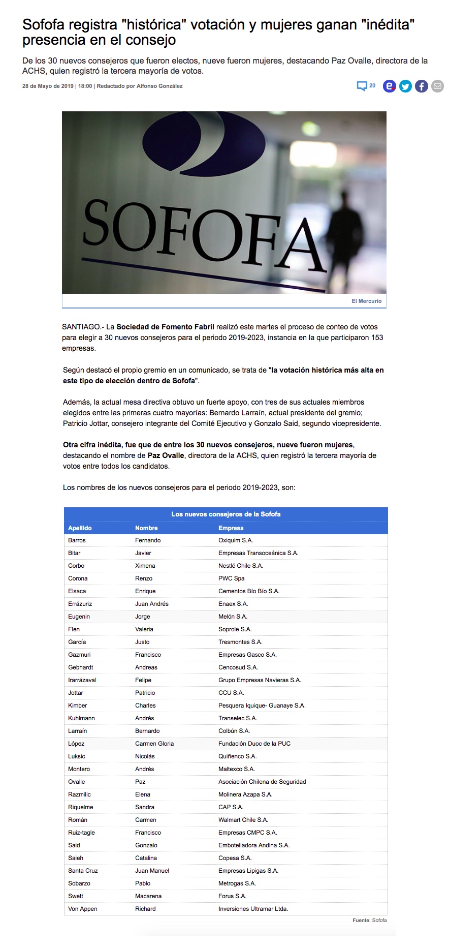 Consejo de la Sofofa eleva a 20% la participación de mujeres y Larraín Matte logra fuerte respaldo - (Pulso)