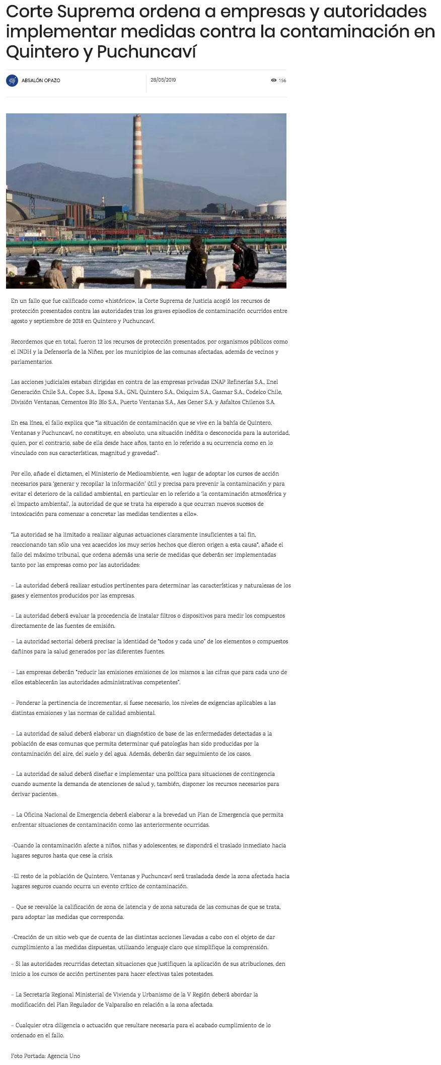 Corte Suprema ordenó a autoridades adoptar 15 medidas para mitigar la contaminación en Quintero-Puchuncaví - (El Mercurio de Santiago)
