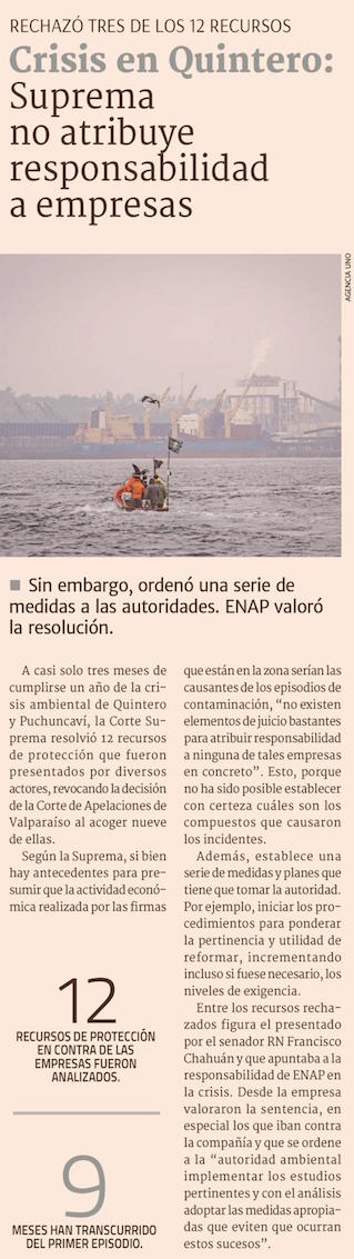 Corte Suprema ordenó a autoridades adoptar 15 medidas para mitigar la contaminación en Quintero-Puchuncaví - (El Mercurio de Santiago)