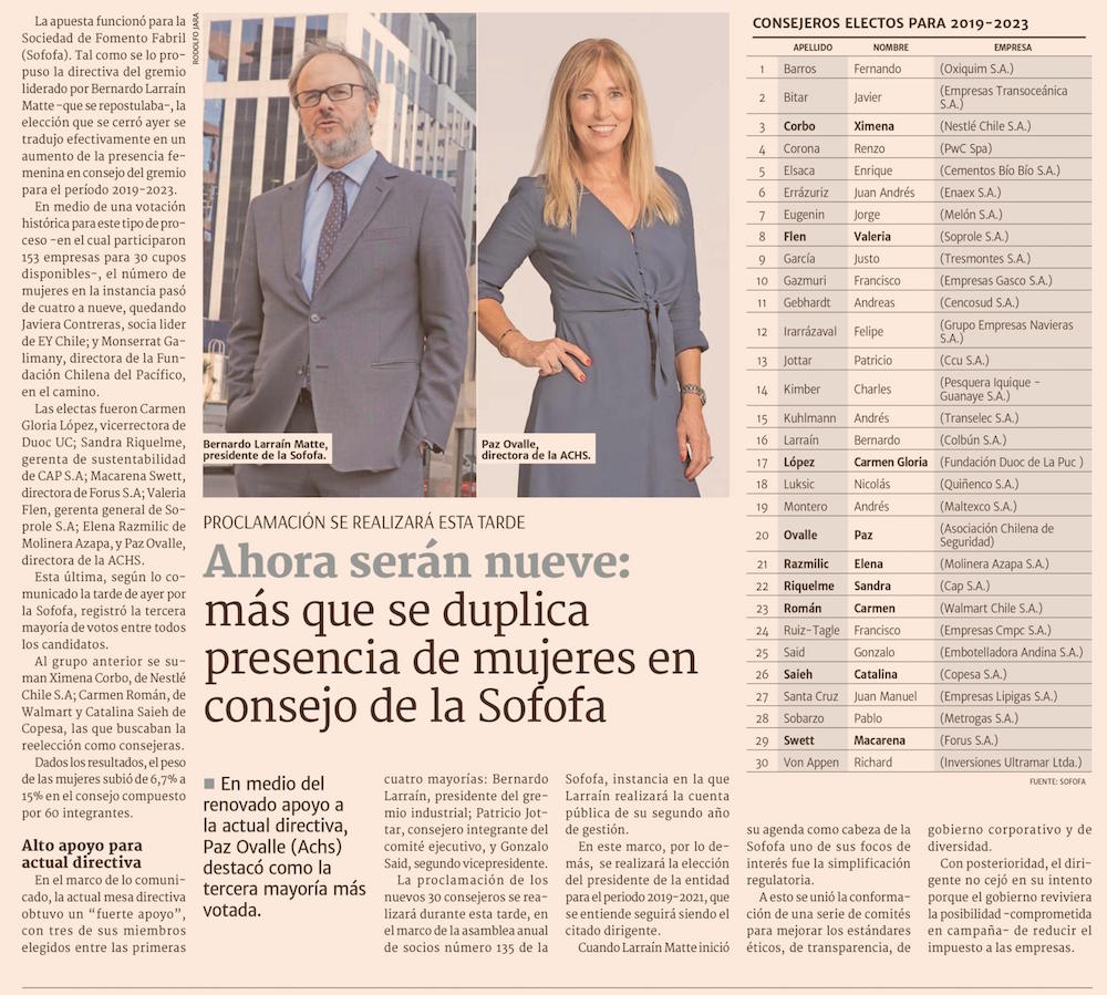 Consejo de la Sofofa eleva a 20% la participación de mujeres y Larraín Matte logra fuerte respaldo - (Pulso)
