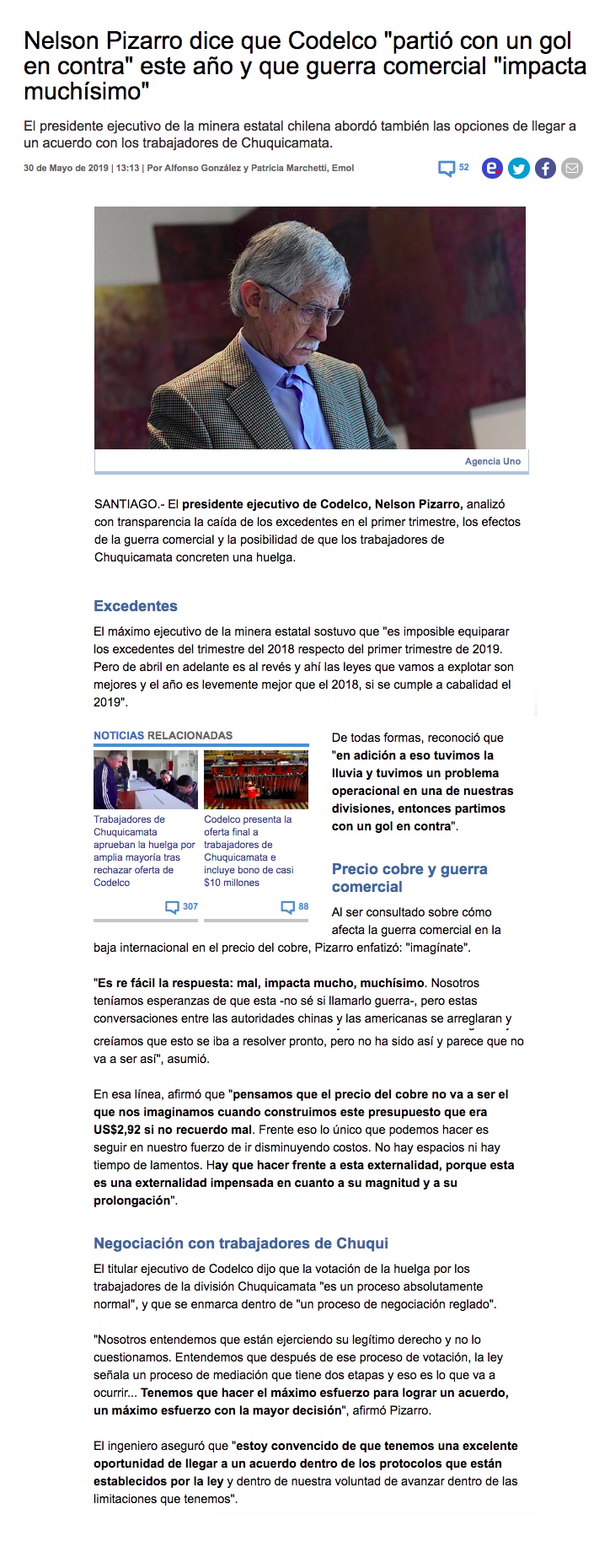 Codelco baja 31% excedentes y Pizarro se muestra optimista ante negociación colectiva en Chuqui - (Diario Financiero)