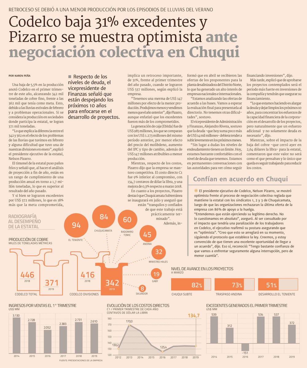 Menor producción de Codelco golpea resultados y excedentes caen 31% - (El Mercurio de Santiago)