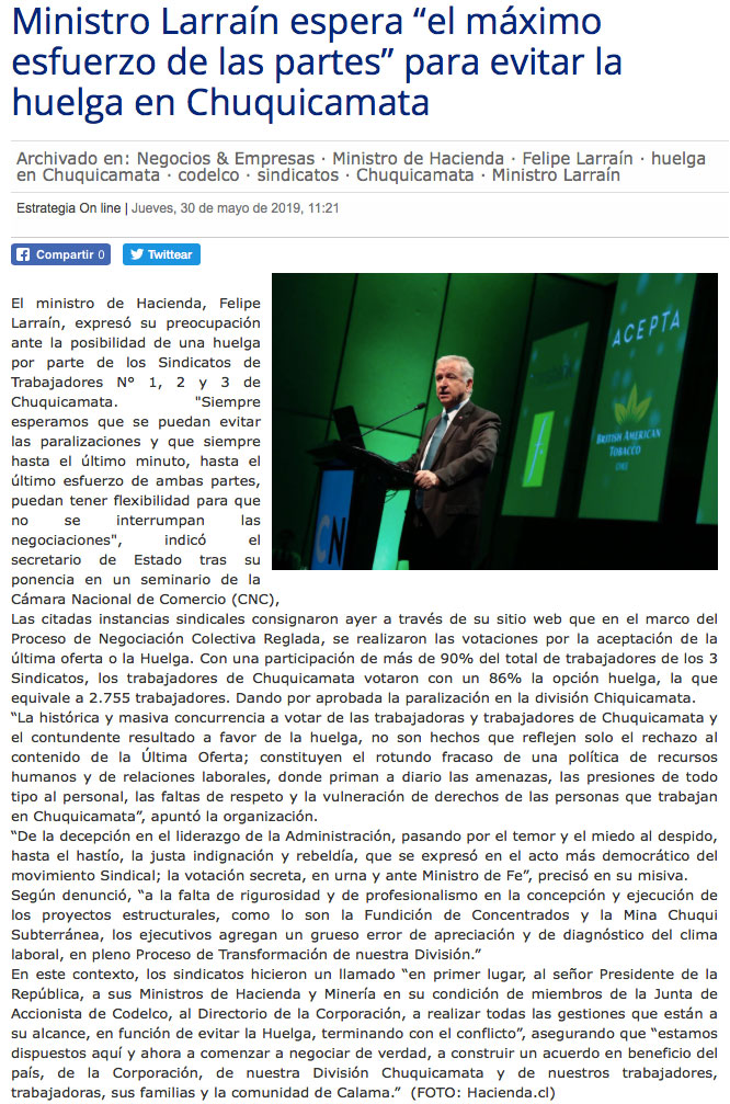 Gobierno llama al diálogo tras votación de huelga en Chuquicamata y dicen estar disponibles para acercar posiciones - (La Tercera Online)