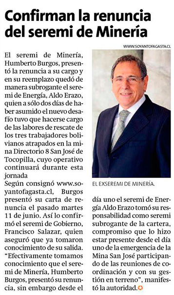 Humberto Burgos renuncia a la seremi de Minería y gabinete suma once bajas - (El Mercurio de Antofagasta)