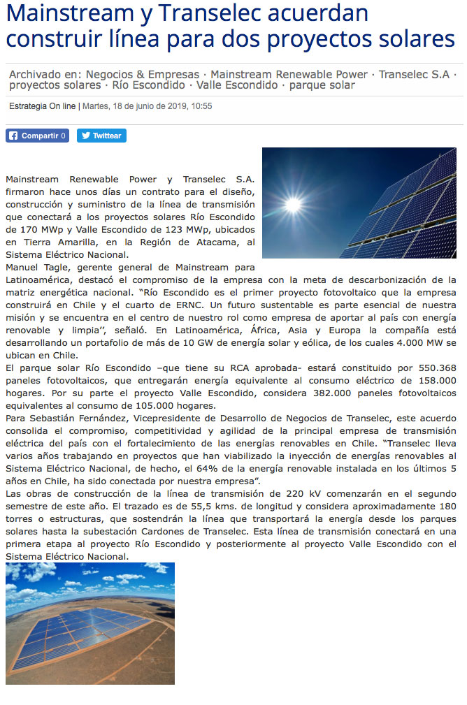 Mainstream y Transelec acuerdan construir línea para dos iniciativas solares - (El Diario de Atacama)