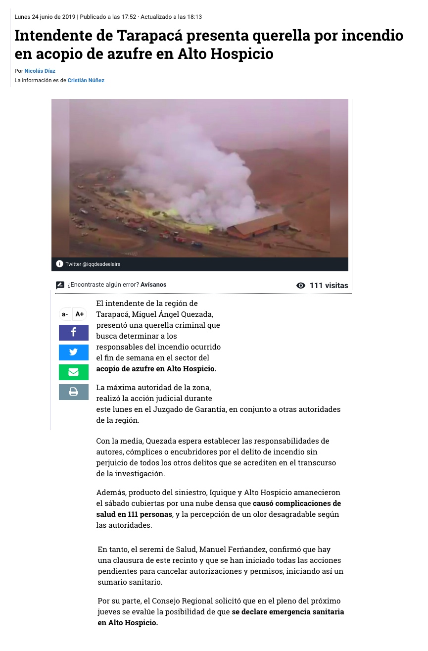 Intendente presentó querella por incendio en azufrera - (El Longino de Iquique)