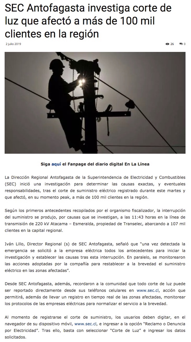 SEC investiga falla que dejó 107 mil clientes sin electricidad en hora punta - (El Mercurio de Antofagasta)