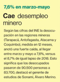 Tasa de desempleo en las regiones mineras cae a un 7,6% - (El Mercurio de Santiago)
