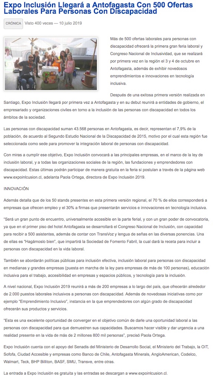 Expo Inclusión llegará a Antofagasta con 500 ofertas laborales para personas con discapacidad - (elamerica)