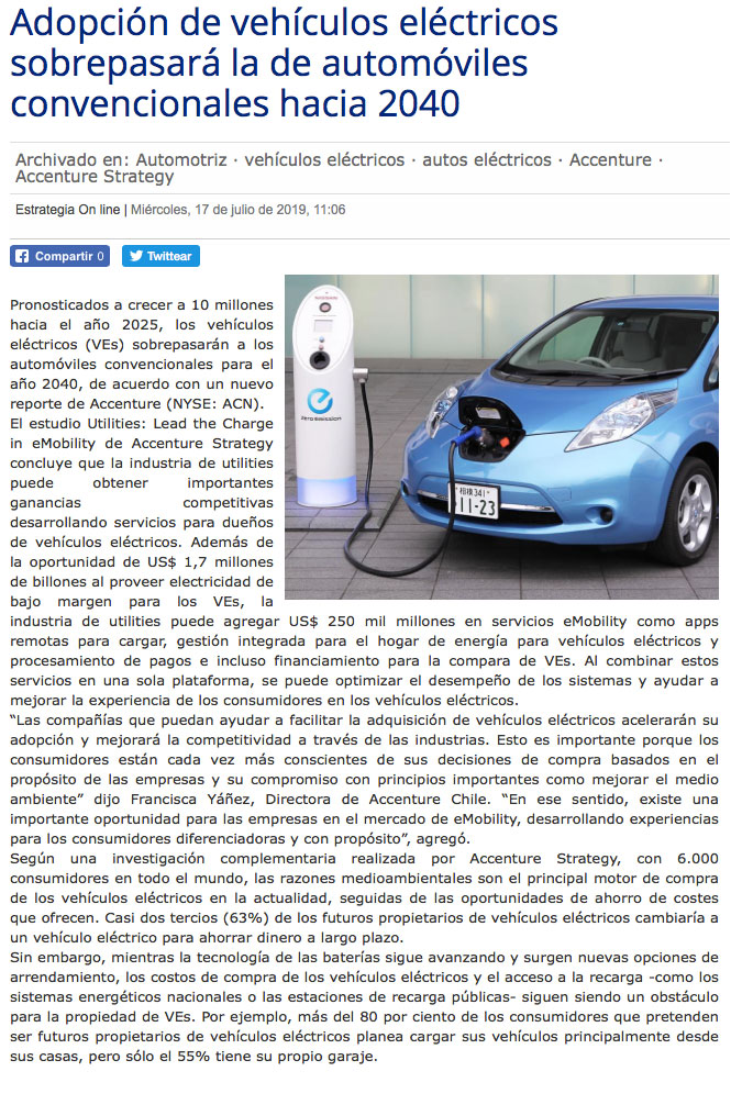 Vehículos eléctricos superarán a los convencionales en 2040 - (Diario Financiero)
