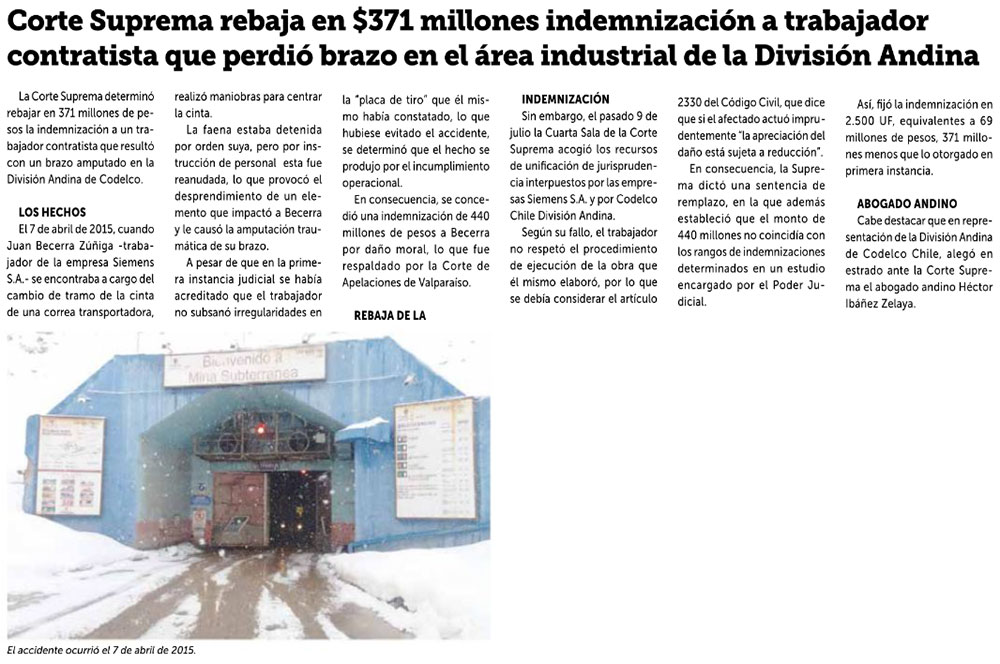 Suprema rebaja en $371 millones indemnización a trabajador que perdió brazo en Codelco Andina - (biobiochile online)