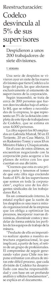 Codelco despide a 114 supervisores del Distrito Norte y en su gran mayoría de Gabriela Mistral - (El Mercurio de Calama)