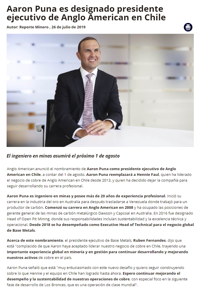 Aaron Puna reemplaza a Hennie Faul a la cabeza de Anglo American Chile - (mch.cl)