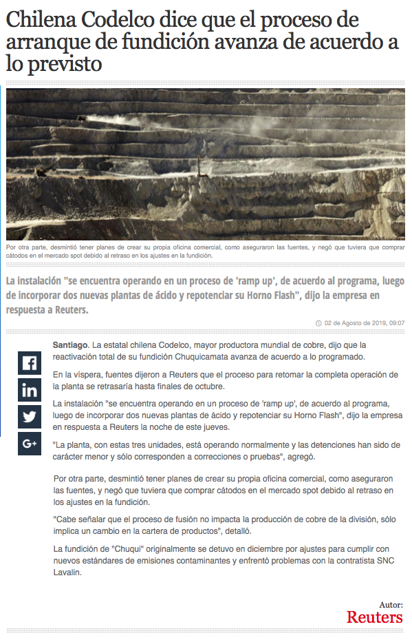 Aseguran que la Fundición de Chuquicamata no está detenida - (El Mercurio de Calama)