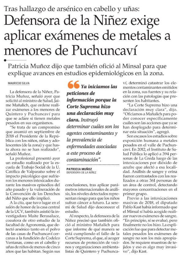 Comunidad de Quintero presiona al Ejecutivo por exámenes toxicológicos - (El Mercurio de Valparaíso)