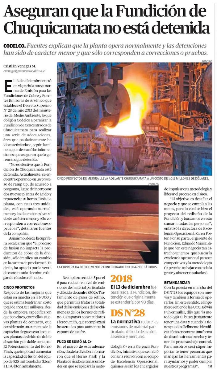 Chilena Codelco dice que el proceso de arranque de fundición avanza de acuerdo a lo previsto - (americaeconomia online)