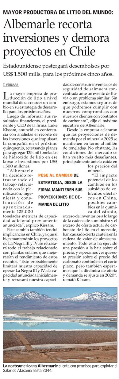 Albemarle retrasa inversiones de litio en Chile y Australia por bajas en los precios - (DF Online)