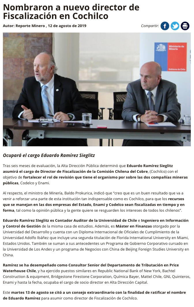 Gobierno nombra a nuevo Director de Fiscalización en Cochilco - (El Mostrador)