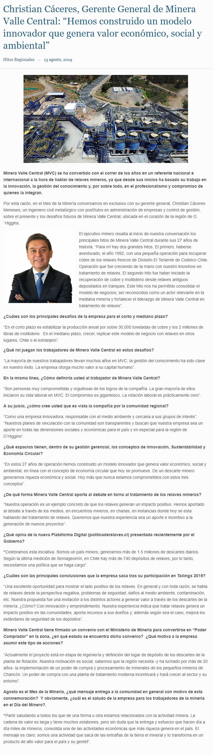 Christian Cáceres, gerente general de Minera Valle Central: “Hemos construido un modelo innovador que genera valor económico, social y ambiental” - (poderyliderazgo)