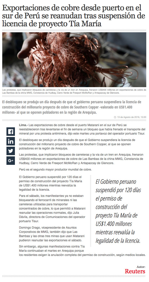 Exportaciones de cobre desde el puerto Matarani se han reanudado - (El Comercio Online (Perú))