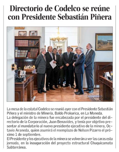Piñera se reúne con Codelco y sindicato se movilizaría en inauguración de Chuqui - (Diario Financiero)