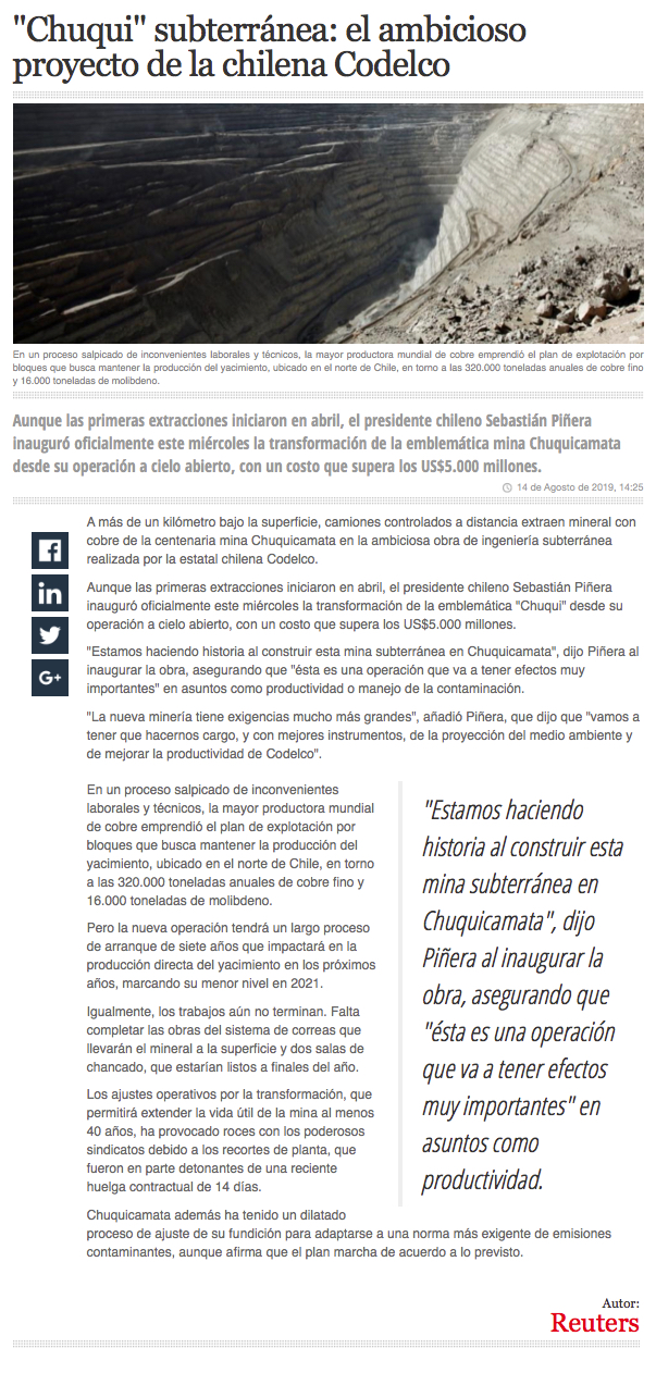 Piñera: La subterránea pone a Chile a la vanguardia de la minería mundial - (El Mercurio de Calama)
