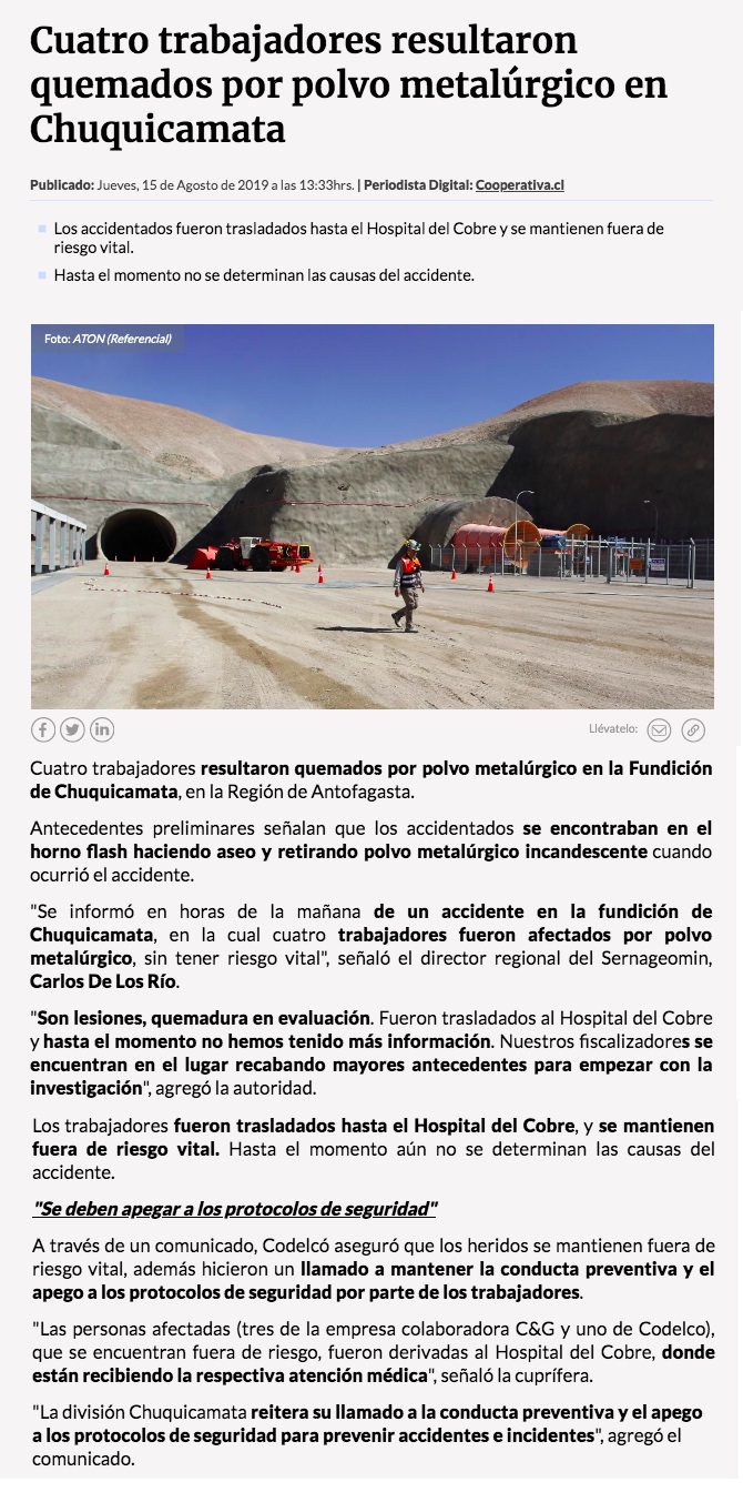 Codelco Norte confirma que trabajadores lesionados están fuera de peligro - (elamerica)
