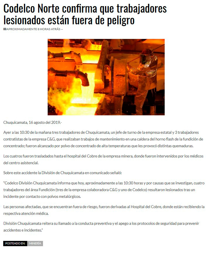Cuatro trabajadores resultaron quemados por polvo metalúrgico en Chuquicamata - (cooperativa online)