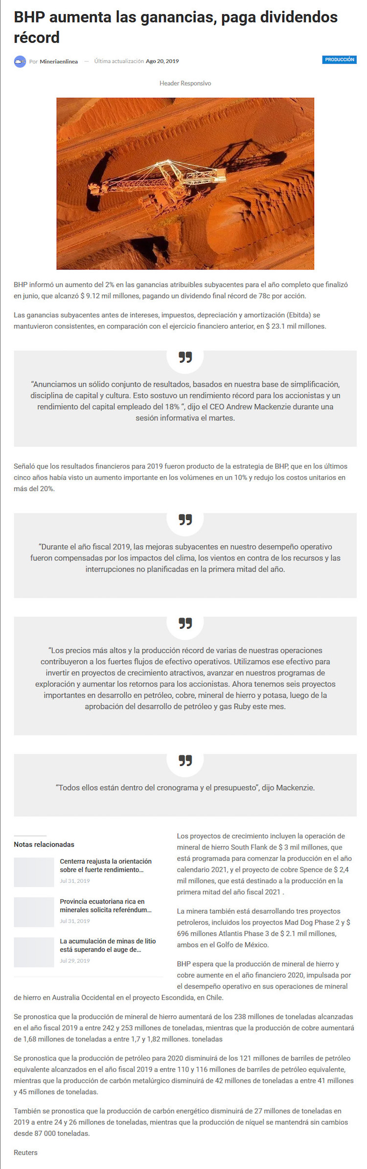 Gigante minero BHP paga dividendo récord, pero alerta sobre crecimiento mundial - (americaeconomia online)
