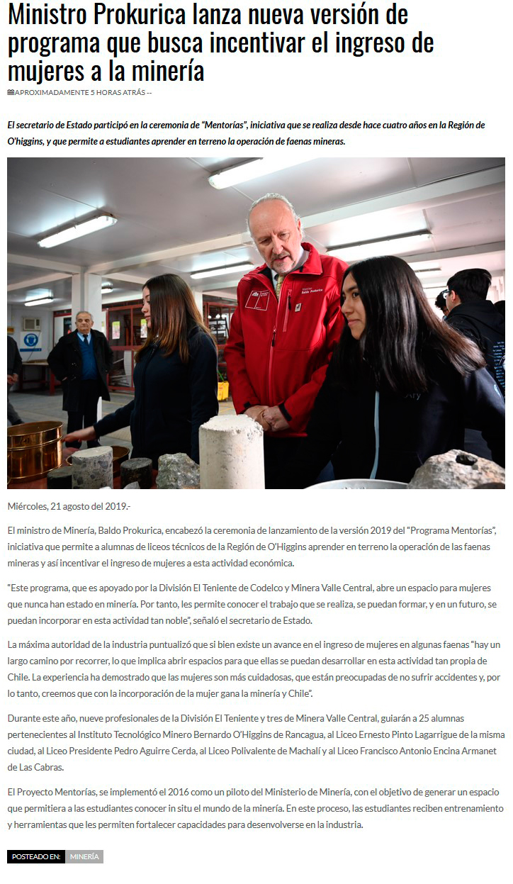 Ministro Prokurica lanza nueva versión de programa que busca incentivar el ingreso de mujeres a la minería - (urbanorural.cl)