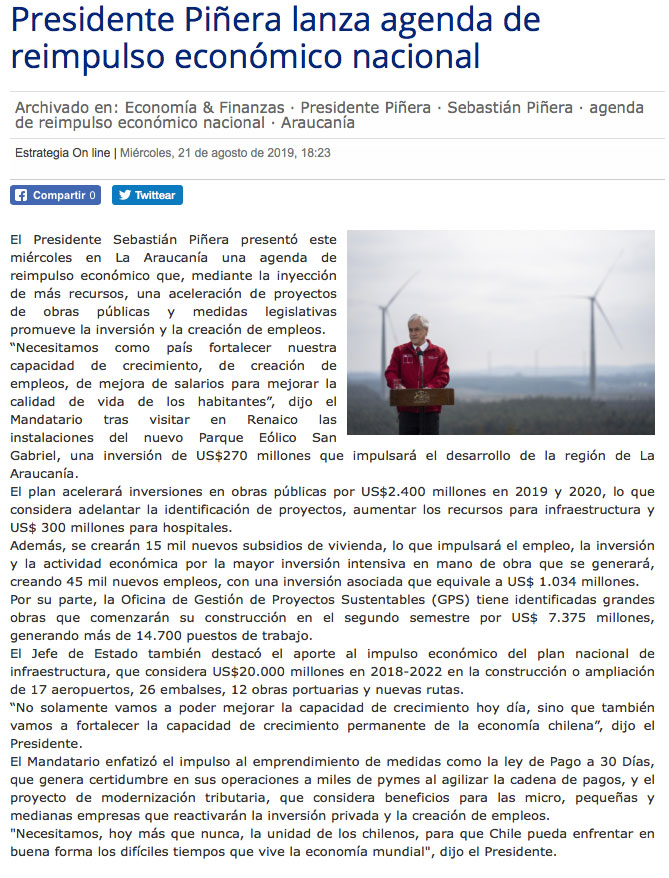 Piñera realza medidas para acelerar inversiones y dejar atrás el pesimismo - (Diario Financiero)