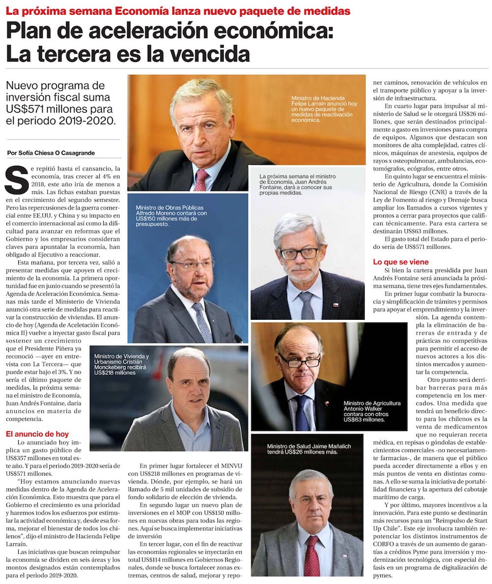 Plan de aceleración del crecimiento económico involucra recursos por casi US$ 3.000 mills. y economistas ven mayor efecto en 2020 - (El Mercurio de Santiago)