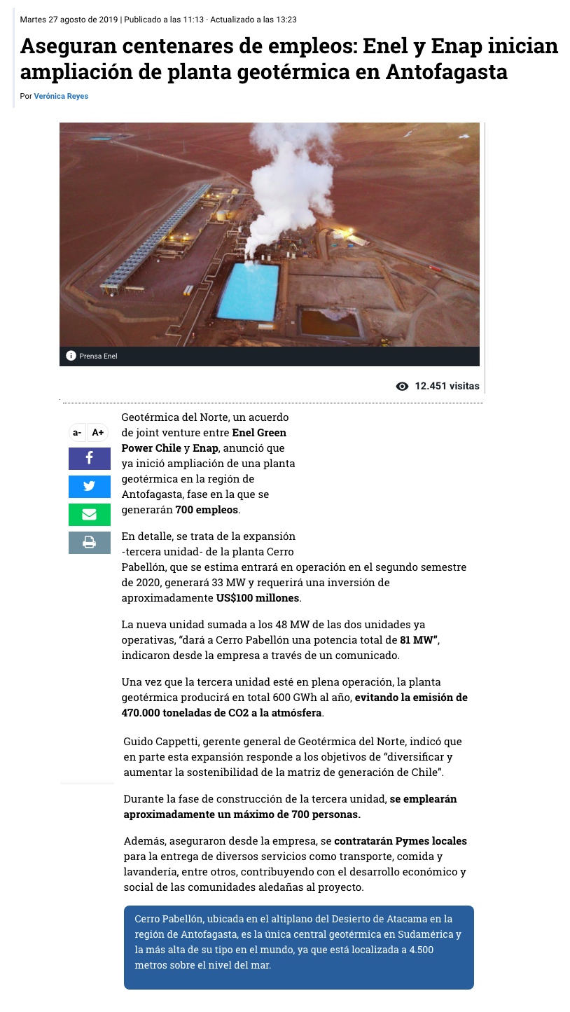 Ampliación de geotérmica Cerro Pabellón considera inversión por US$100 millones - (El Mercurio de Calama)