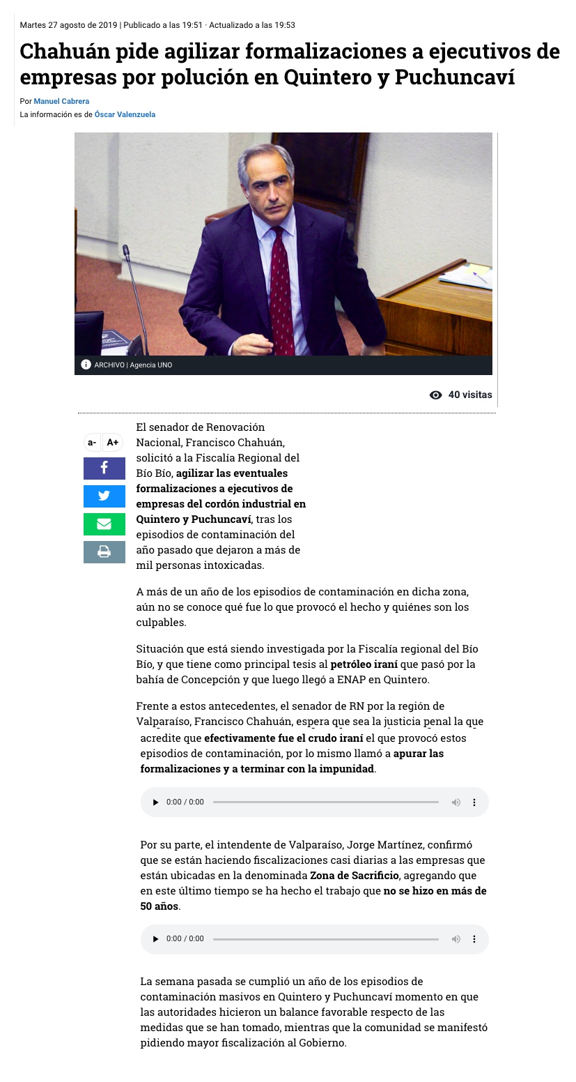 Senador pide sanciones penales por contaminación - (Estrella de Valparaíso)