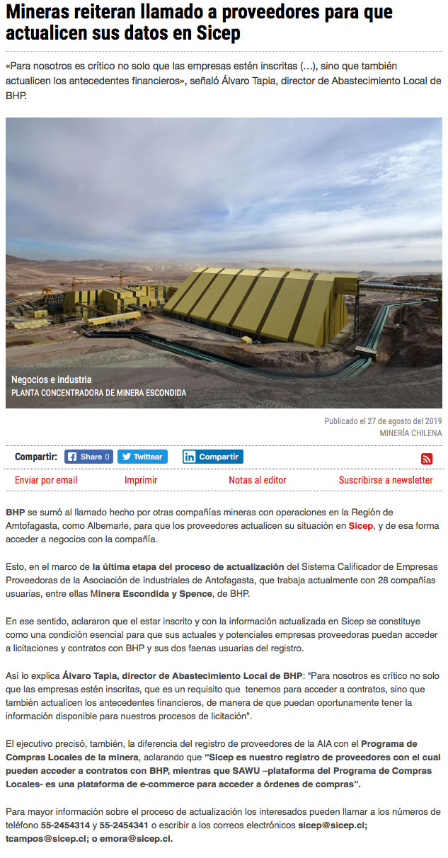 BHP llama a proveedores a actualizar situación en SICEP - (reporteminero)