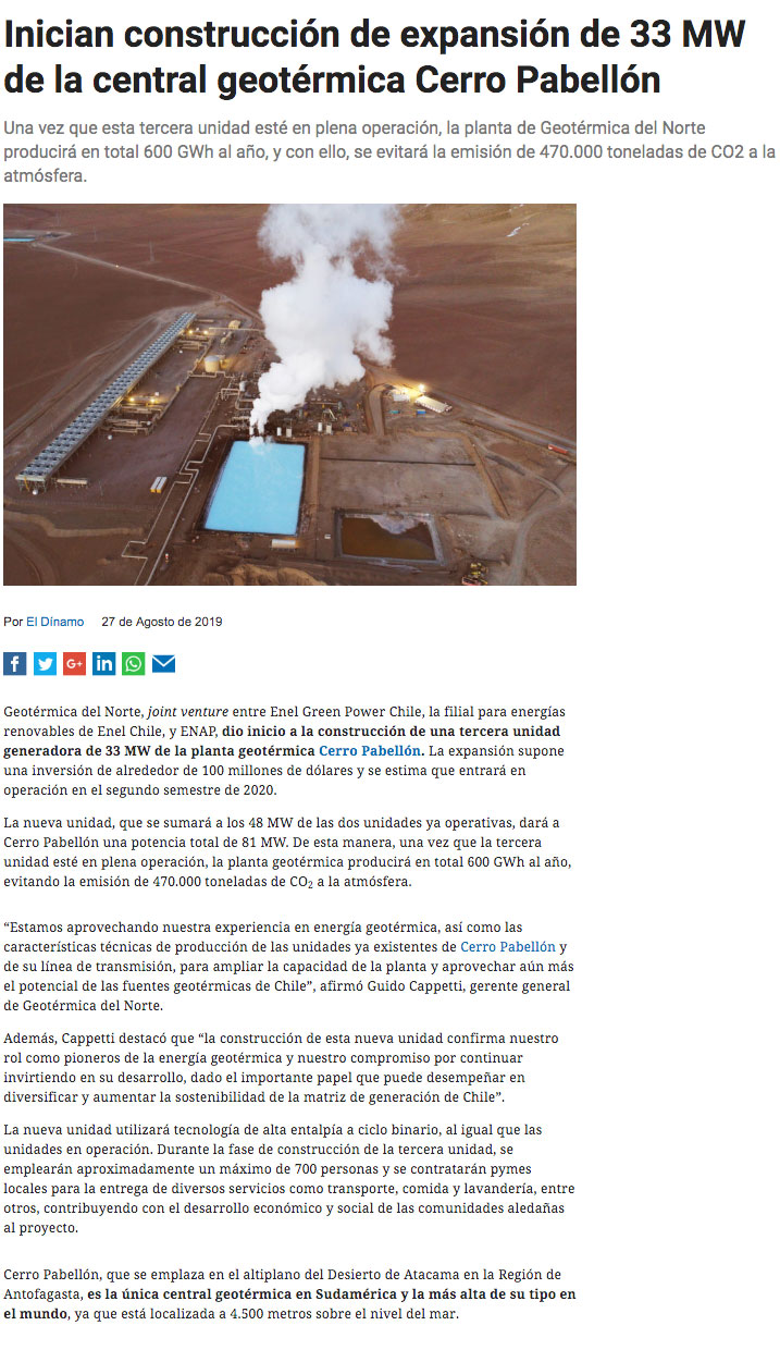 Ampliación de geotérmica Cerro Pabellón considera inversión por US$100 millones - (El Mercurio de Calama)