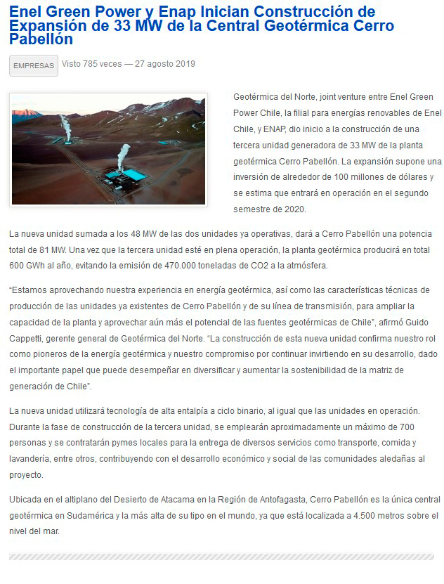 Ampliación de geotérmica Cerro Pabellón considera inversión por US$100 millones - (El Mercurio de Calama)