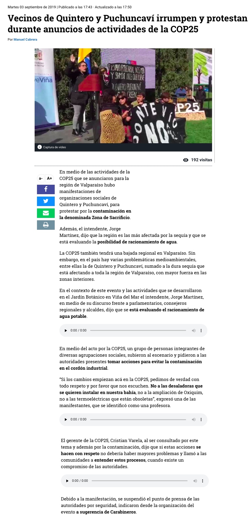 Dura crítica al Gobierno en el lanzamiento de la COP25 - (El Mercurio de Valparaíso)
