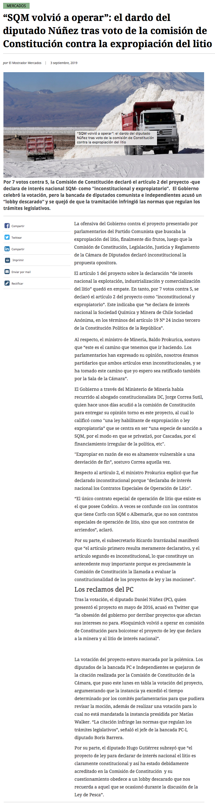 Diputado Núñez critica lobby de Ministro de Minería contra proyecto litio-SQM en Comisión de Constitución - (elciudadano)