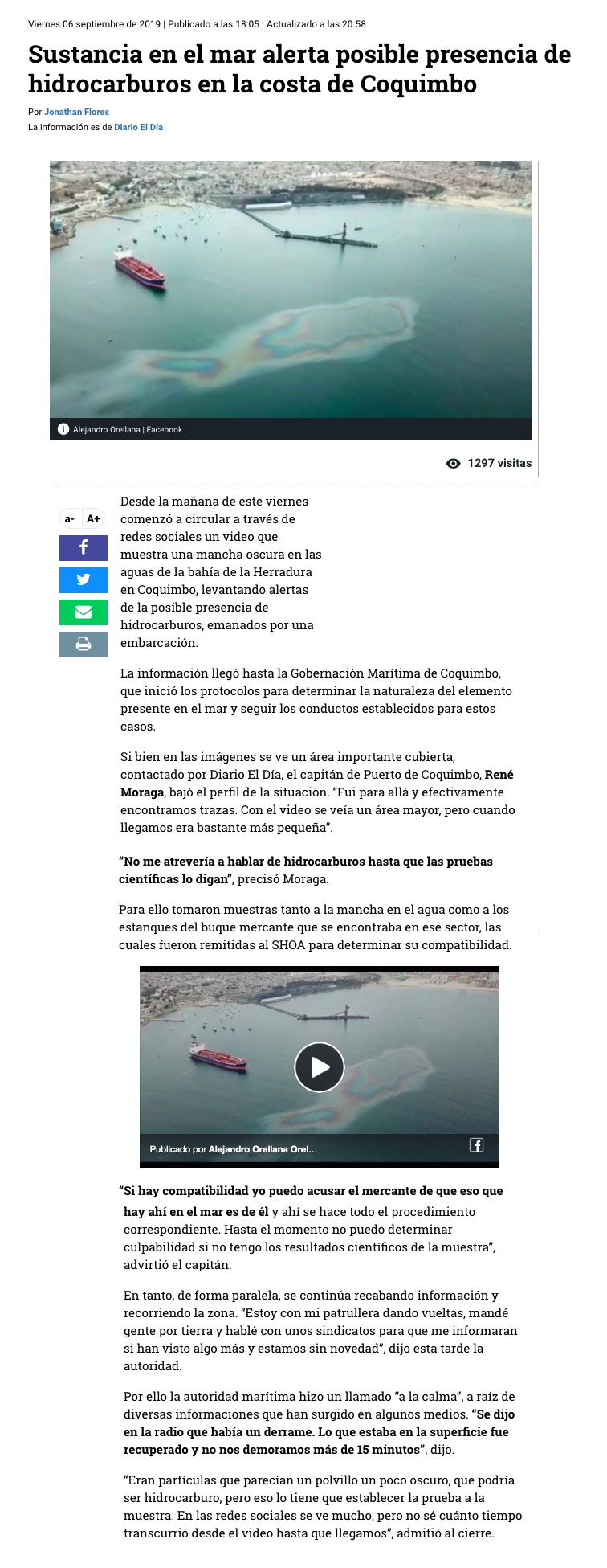 Sustancia en el mar alerta por posible presencia de hidrocarburos en Coquimbo - (El Día)