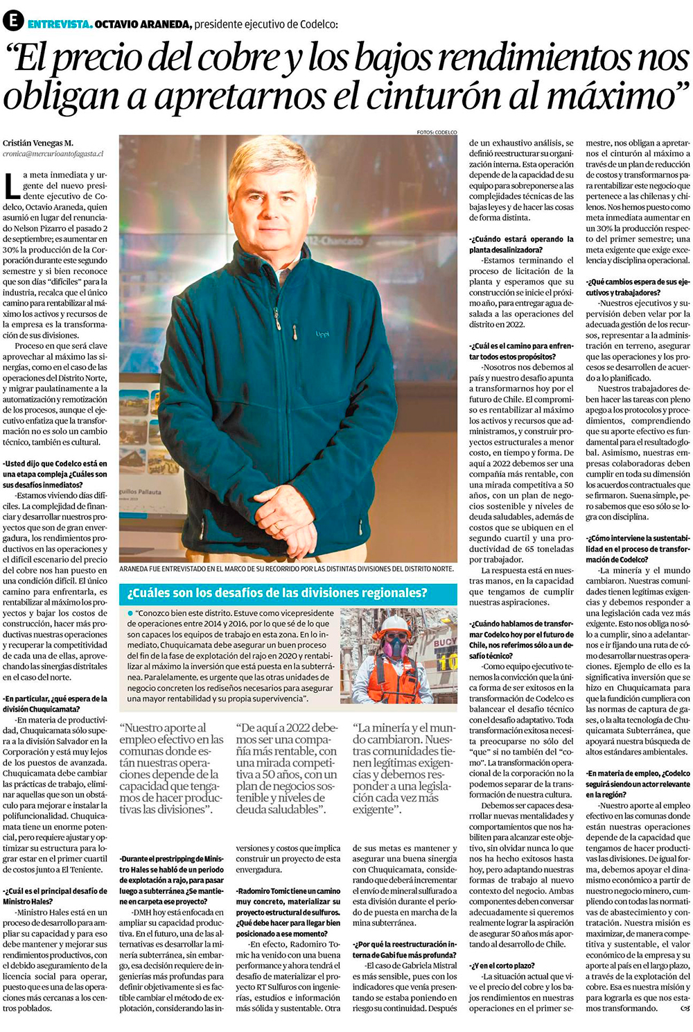 “El precio del cobre y los bajos rendimientos nos obligan a apretarnos el cinturón al máximo” - (El Mercurio de Calama)