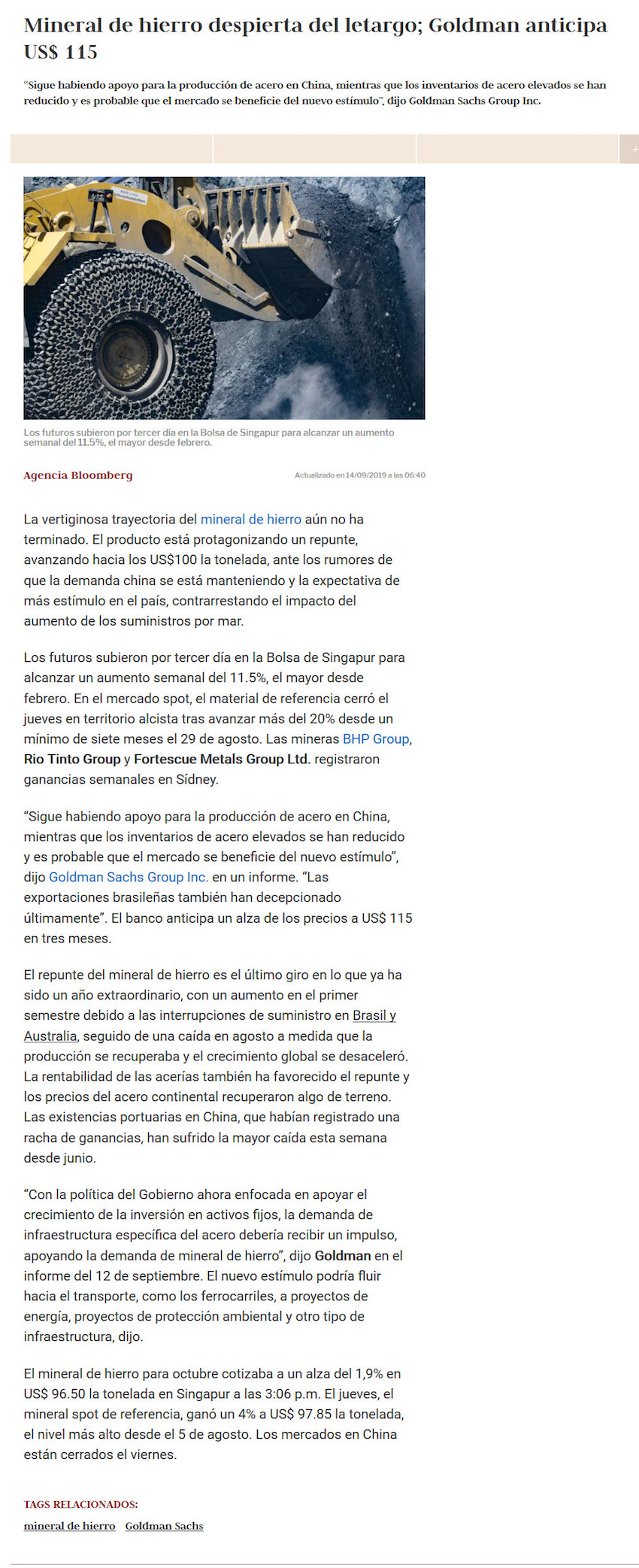 Mineral de hierro registró su mejor semana desde febrero y podría seguir subiendo - (La Tercera Online)