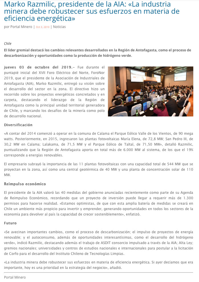 Marko Razmilic, presidente de la AIA en Foronor 2019: “La industria minera debe robustecer sus esfuerzos en materia de eficiencia energética” - (poderyliderazgo)